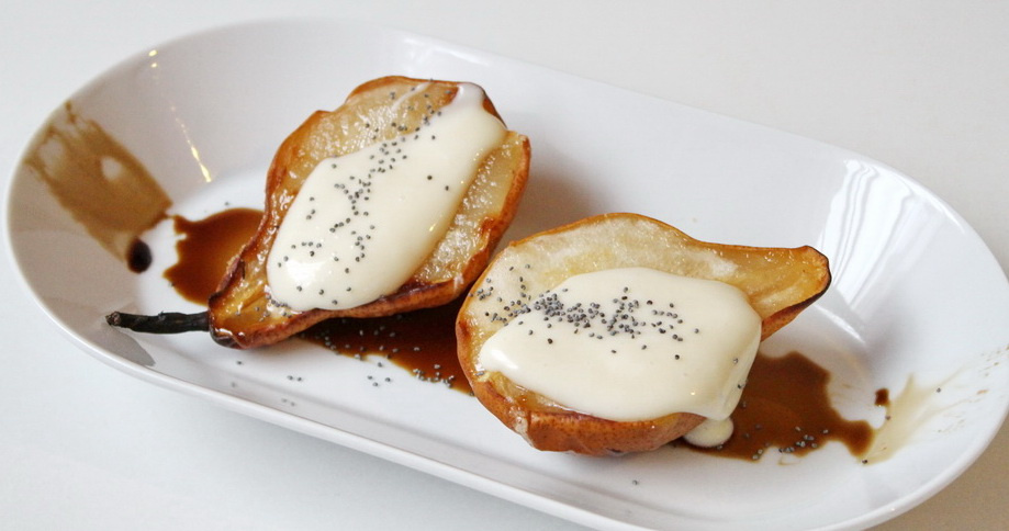 While they are cooling, prepare the cream. Put the honey, the room temperature soy milk and the poppy seed oil in a mixing bowl and blend it creamy with continuous, up and down movements in a few seconds. Keep the cream in the fridge until serving. Before serving, dash some apple balsamico crema on the plate, place on it the baked pears and crown each piece with a teaspoonful of poppy seed cream. Finally, sprinkle them delicately with whole poppy seeds.